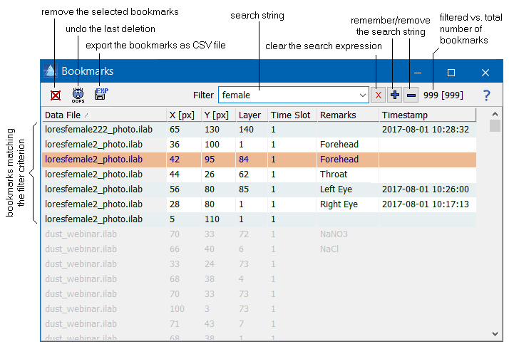 You can filter the bookmark list, so that only part of the bookmarks are displayed. The filter criterion is considered to be a substring of the filename or a substring of the comment. This way you can constrain the list of bookmarks to a particular type of bookmarks. Please note that there are two different modes of filtering: simple substring search and logical search (see Preferences (option "Filter Mode for Text Filters") and Logical Combinations in Filter Expressions for more). If you double-click a bookmark entry Epina ImageLab loads the corresponding spectrum and shows the location of this spectrum. Please not that the bookmarking tool is solely intended for navigation in the datasets. If you want to collect spectra for further processing a better tool would be the Spectral Collection tool. |