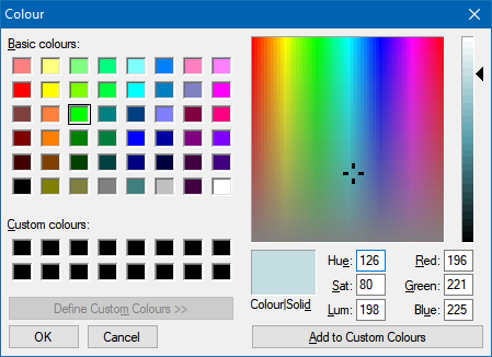 The function SelectColor opens the color selection dialog. The parameter DefaultColor is the initially selected color. The function returns either the color value $80000000 if the user clicks "Cancel" or the color selected by the user if the user clicks the "OK" button.