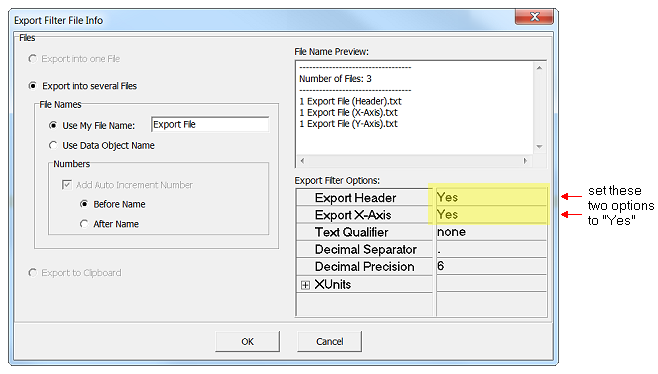 - Ensure that the "Export Header" and "Export X-Axis" options are set to "Yes"