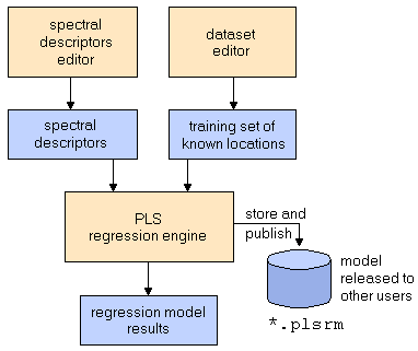 This tool allows the design of a PLS-based regression model. You first have to define and/or load a set of spectral descriptors and a set of training data. The training dataset specifies individual points in an image with known class quantitative values (e.g. concentrations). After the design-process the model can be stored and applied to other data sets.